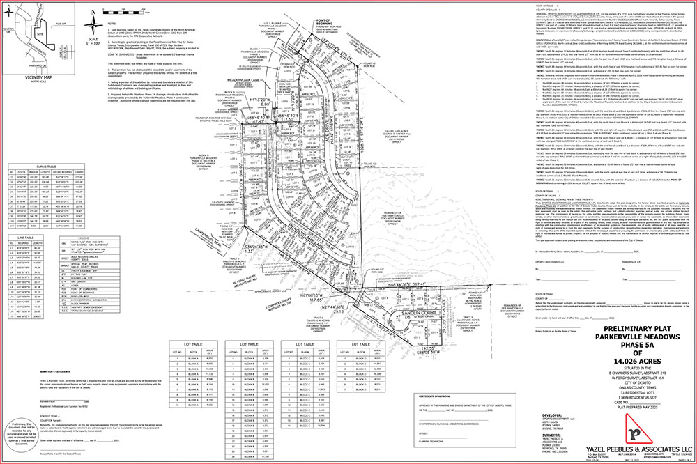 Parkerville Meadows Phase 5 is a 50+ residential lot development in Desoto, TX. The land for this development is approximately 14 acres and is located off I-35 and Parkerville Road.